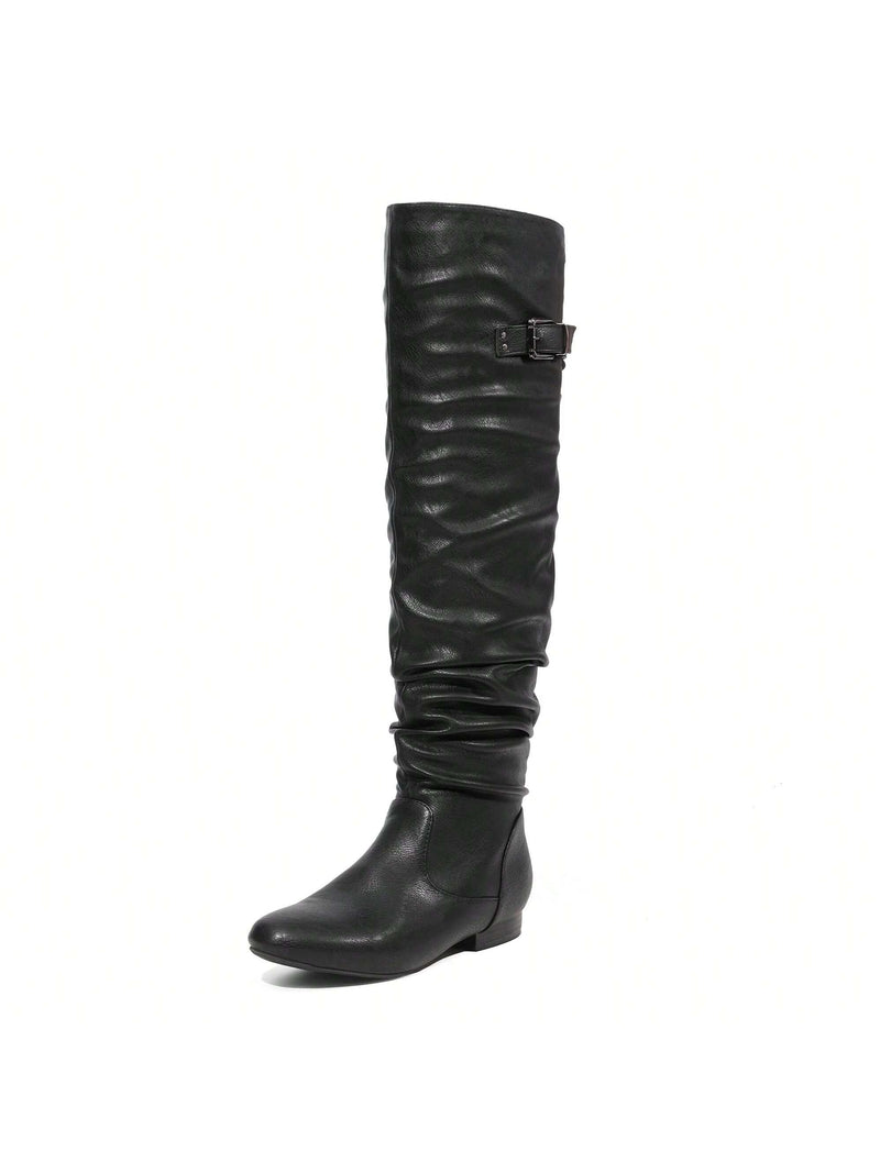 Women Black Knee High Riding Boot in Faux Suede with Buckle Decor Zipper Side